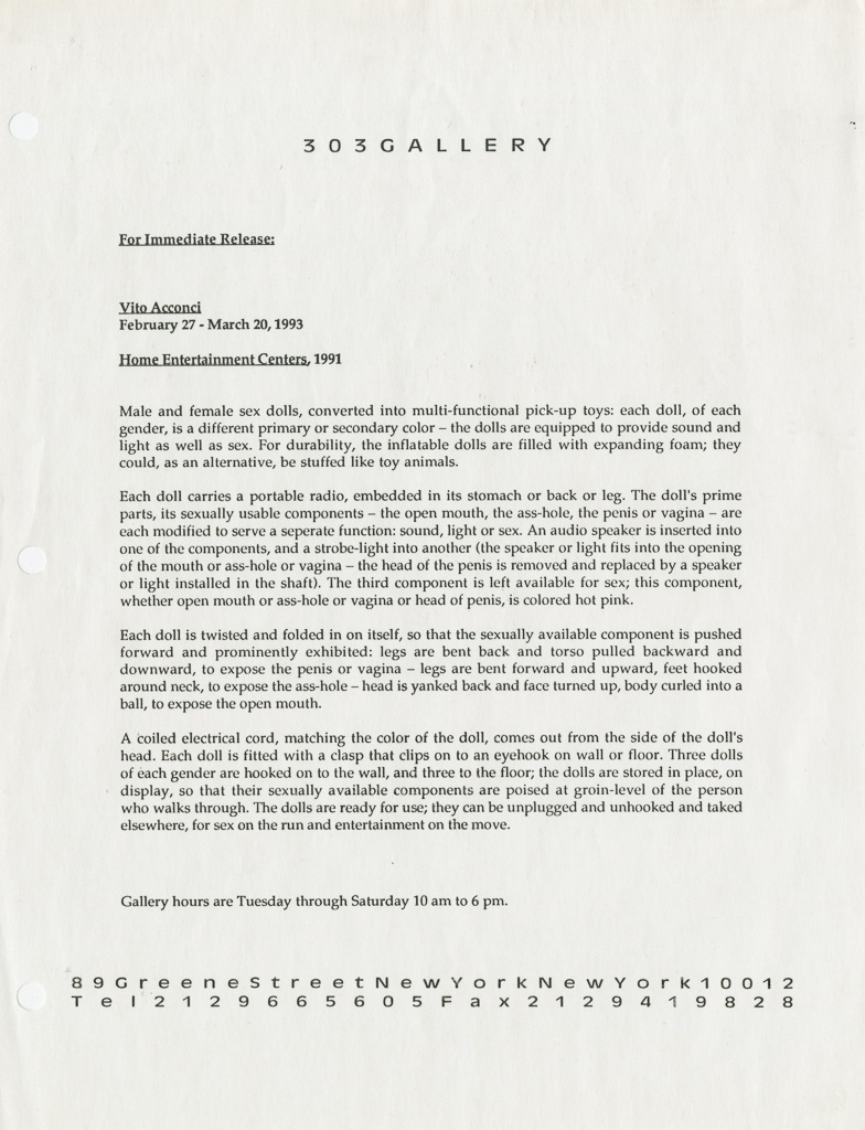 Each doll carries a portable radio, embedded in its stomach or back or leg. The doll's prime parts, its sexually usable components - the open mouth, the ass-hole, the penis or vagina - are each modified to serve a separate function: sound, light or sex. An audio speaker is inserted into one of the components, and a strobe-light into another (the speaker or light fits into the opening of the mouth or ass-hole or vagina - the head of the penis is removed and replaced by a speaker or light installed in the shaft). The third component is left available for sex; this component, whether open mouth or ass-hole or vagina or head of penis, is colored hot pink.